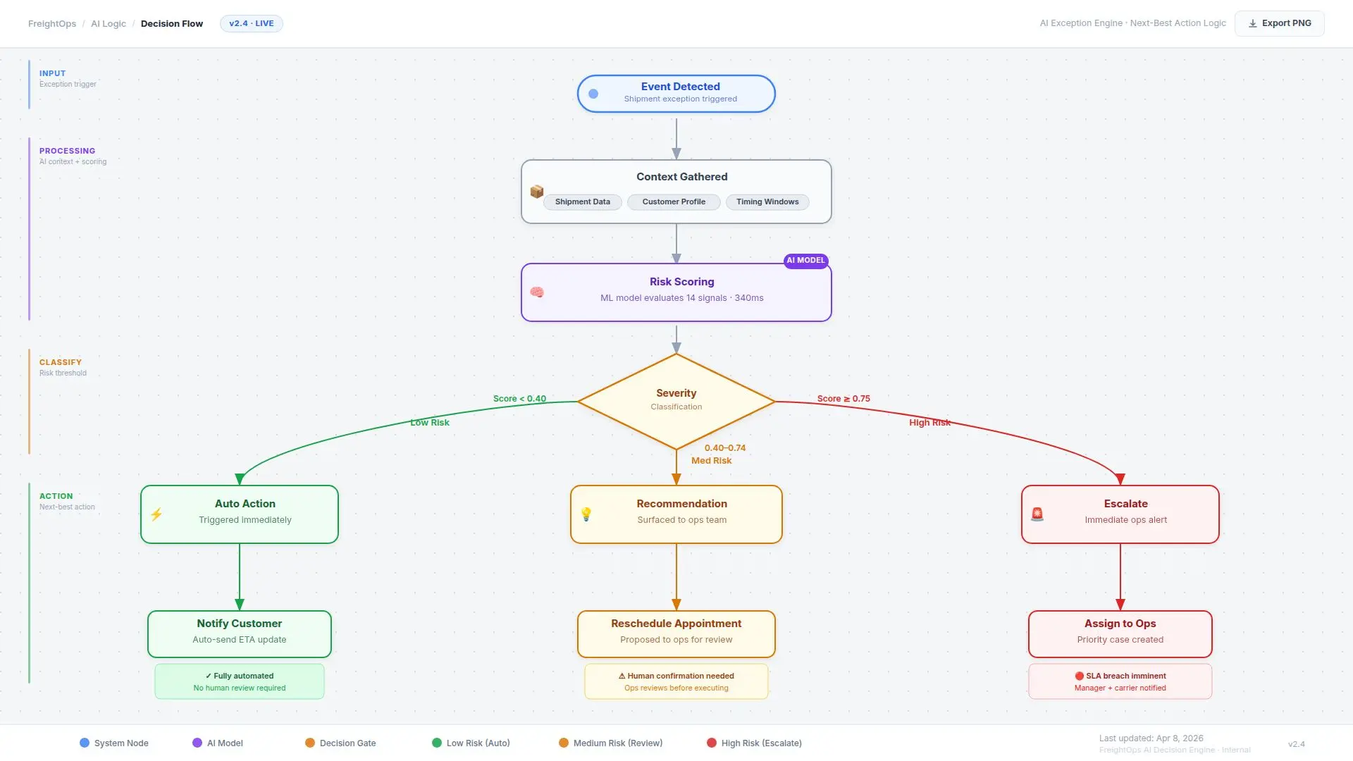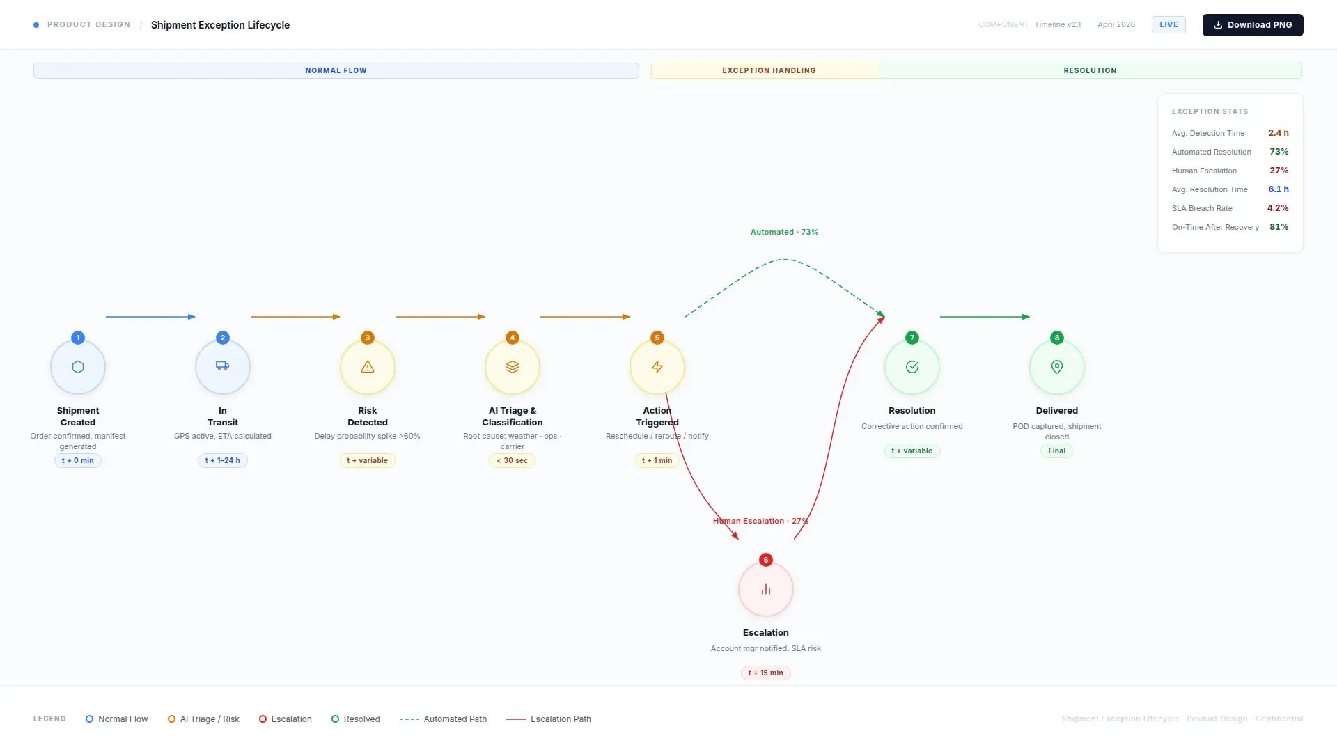We designed the exception classification model, escalation rules, next-best-action logic, and user workflows for dispatch and customer operations.