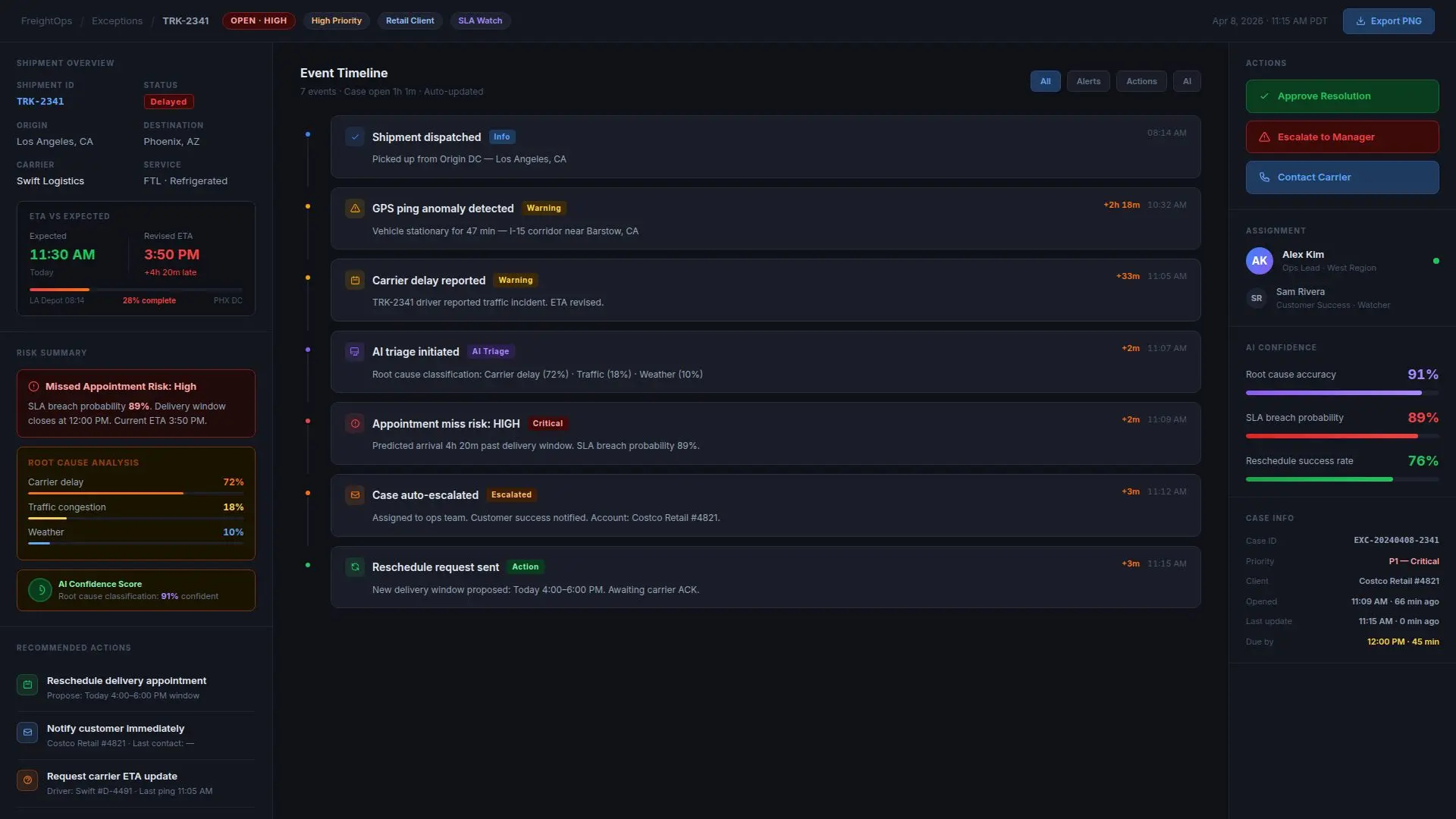 This maps directly to one of the biggest logistics pain points in your research: operations teams spend significant time triaging exceptions, identifying root causes, deciding on next actions, and coordinating updates across teams and systems.